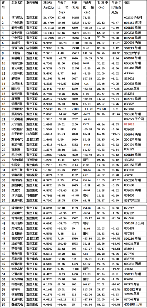 以视频监控工程为主的上市公司(项目)减少的比增加的多1家。去年我们选择了58家视频监控集成与工程类公司,今年减少到57家,其中3家是上市公司的子公司。这57家企业2019年业务数据见表4-1。