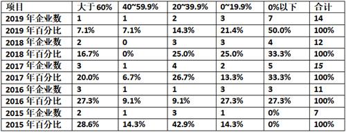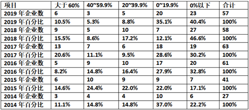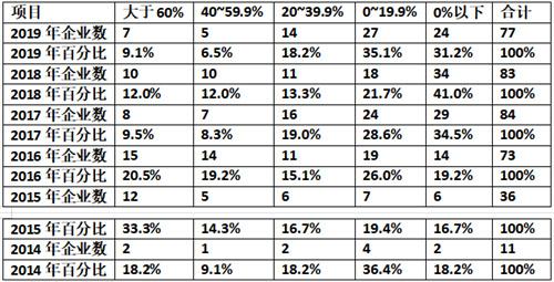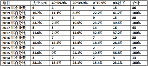 我们将2014-2019年这6年视频监控工程类上市公司营业收入按照增长幅度大于60%、40~59.9%、20~39.9%、0~19.9%和0%以下5类分别进行统计家数及所占比例列表,具体数据见表4-2。