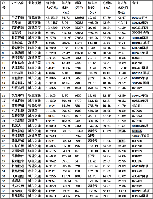 智能交通类2018年度我们采集数据的是38家上市公司,今年减少到36家,少了2家。这36家企业2019年的业务数据见表4-4。