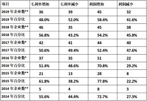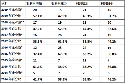 2018年企业的毛利率情况比2017年有较大改善,毛利率增加的比例仅次于2015年和2019年,处于6年中的第三位;但由于收入负增长是历年次高的,因此利润增加的比例是历年最低的,排在第六位。2017年毛利率增长比例仅高于2016年处于第五位,但利润增长比例好于2018、2014年处于第三位。2016年年利润增加比例指标与2015相同,但毛利率要差一些,排在第二位。2015年是毛利率与利润增长比例最高的一年,排在第一位。2014年利润增加比例排在第四位。