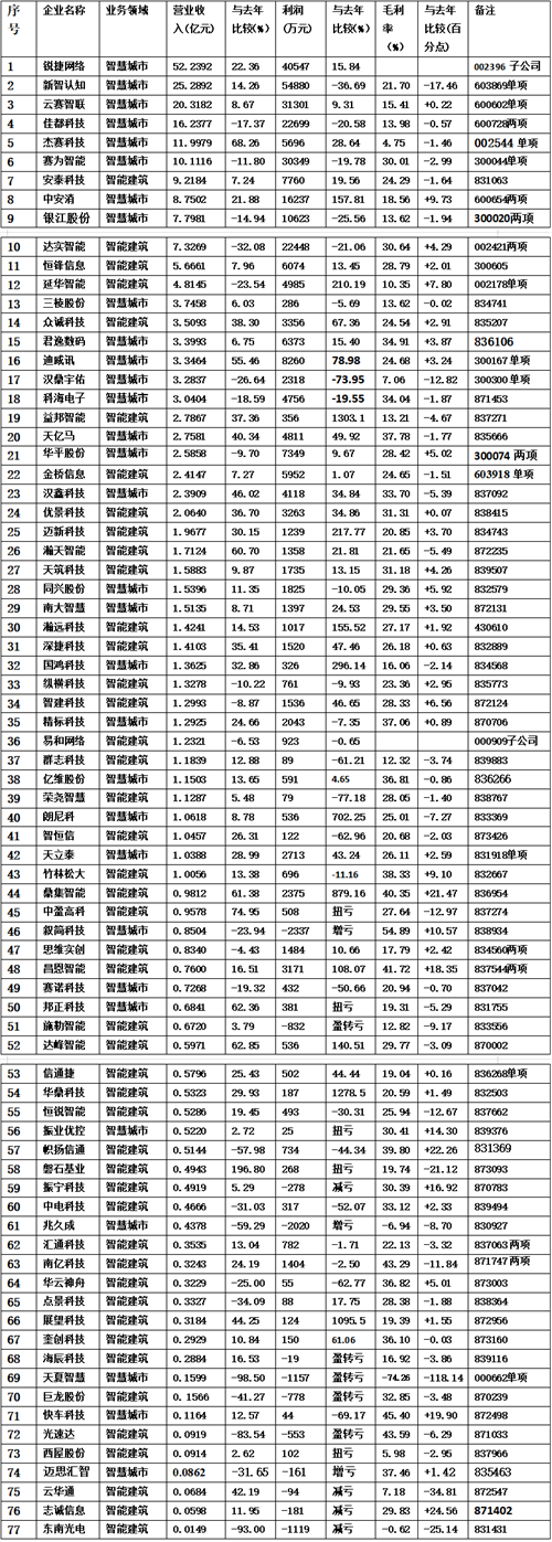 与我们收集2018年智慧城市系统集成与工程类上市公司年报数据时相比,2019年度新增加了智恒信1家上市公司,银江股份由智能交通单项调整为智能交通为主智慧城市为辅两项;金桥信息由监控工程调整到智慧城市;帜扬信通由视频工程调整为智慧城市;亿维股份由监控工程调整到智慧城市;振业优控由监控工程调整到智慧城市;迈思汇智由智能交通调整到智慧城市;华平股份由监控工程调整为以智慧城市为主监控工程为辅的两项;合计增加8家公司(项)。2019年度有瑞特科技、亿联科技、云康智能、佳缘科技、新豪智云、科海股份、创能科技、云智科技、中创智慧、天程科技、弘信科技、中业股份等12家智慧城市类原新三板公司终止挂牌,致生联发停产缺少业务数据;华网智能以智慧城市为主监控产品为辅两项调整为监控(激光夜视)产品,合计减少14家(项)。