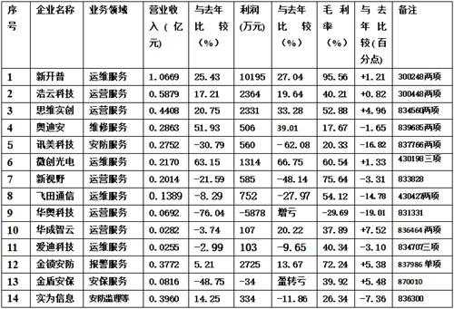 注:新开普两项以一卡通系统为主,运维为辅;浩云科技两项以监控集成为主,运营服务为辅;思维实创两项以智慧城市为主,运营服务为辅;奥迪安两项以监控工程为主,维修服务为辅;讯美科技两项以监控设备为主,安防服务为辅;微创光电三项以传输设备为主,监控工程、运维为辅;飞田通信两项以智能交通为主,运营服务为辅;华成智云两项以监控软件(包括技术服务)为主,运营服务为辅;爱迪科技三项以监控工程为主,停车管理、运维服务为辅。