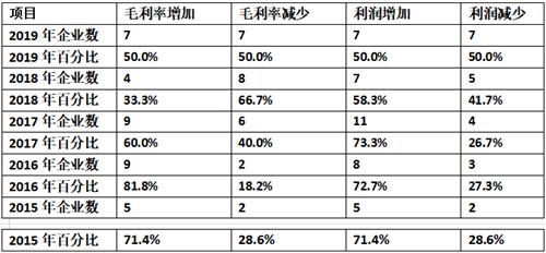 我们在下面的表4-6中统计了近6年智能交通工程企业毛利率和利润的增长或下降的数据,由于2014-2019这6年各有1家是没有产品毛利率数据的子公司,因此2014-2019年有毛利率数据公司的数量比有利润数据公司的数量各少1家,此外,2018年另有一家公司的产品毛利率没有变化,2018年有毛利率变化的公司要少2家。